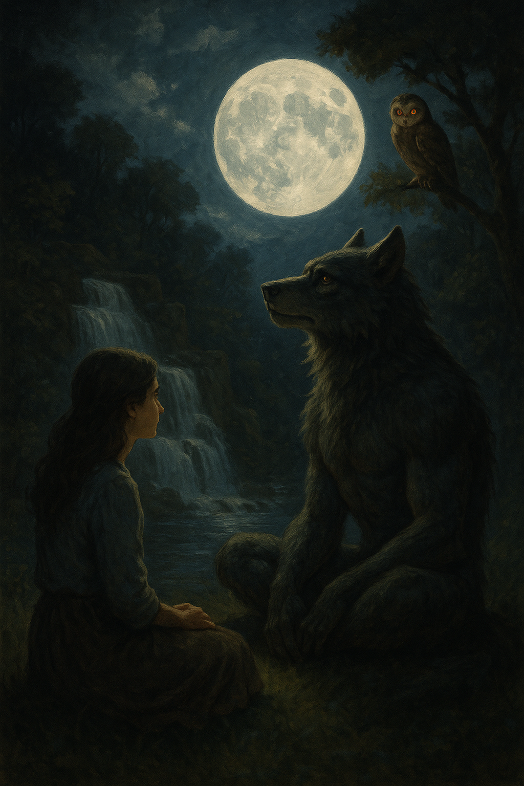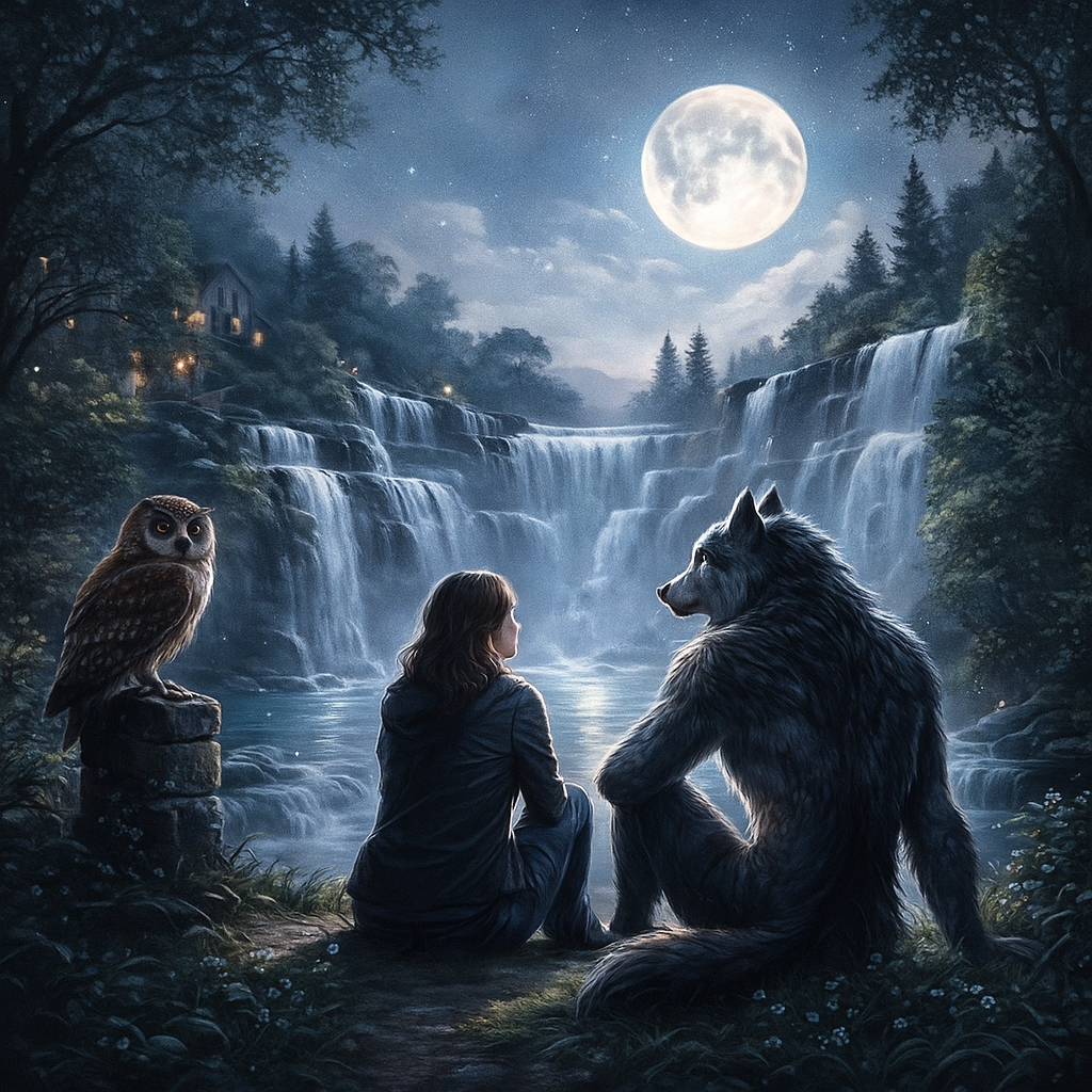 El licántropo está sentado sobre la hierba húmeda, envuelto en la luz de la luna. Su presencia es imponente, pero no monstruosa; es la presencia de alguien que pertenece a dos mundos sin ser completamente de ninguno. La luz plateada se derrama sobre él como un agua silenciosa que lo alimenta y alivia.